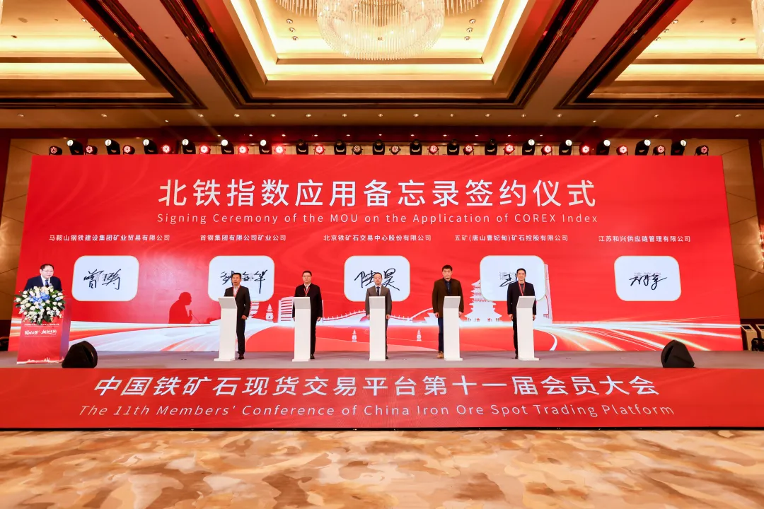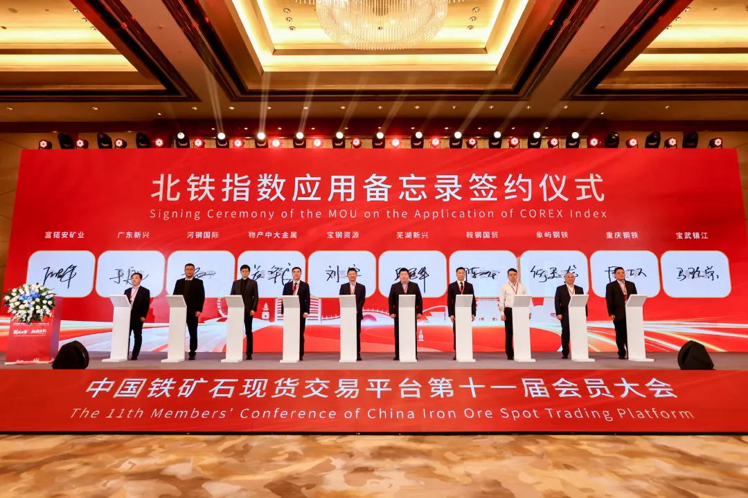会上举行了北铁指数应用备忘录签约仪式,5组、共10家钢铁和贸易企业签署备忘录,逐步在铁矿石贸易中采用北铁中心发布的港口现货价格指数作为结算依据。北铁中心与4家国产铁矿石和混矿企业签署协议,推动指数在国产矿和混矿交易中的应用。